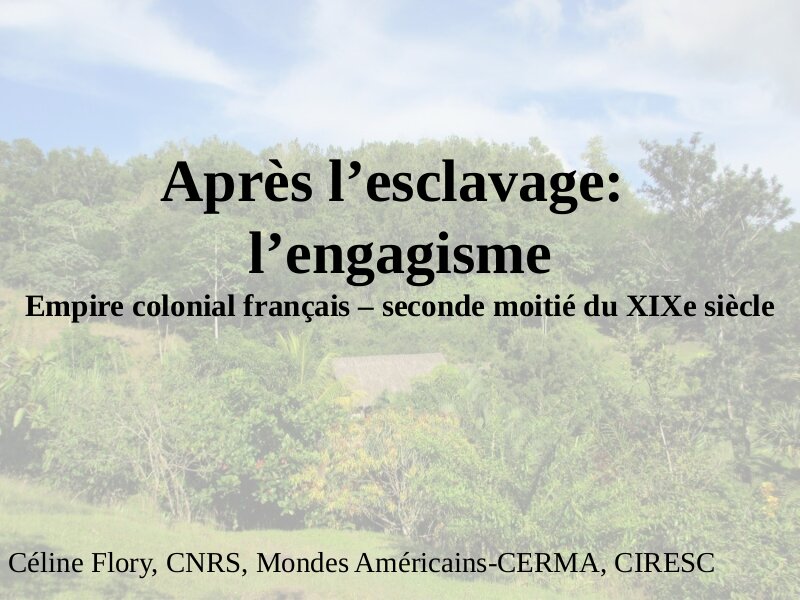 Céline Flory est docteure en Histoire, Chargée de Recherche au CNRS, membre du laboratoire Mondes Américains et depuis 2012, membre du bureau du Centre International de Recherches sur les Esclavages et les post-esclavages (CIRESC). Elle a été également membre du programme ANR ALTER « Histoires orales alternatives dans la Caraïbe (XIXe-XXIe siècles). dans la Caraïbe (XIXe-XXIe siècles). Ses recherches doctorales analysaient l’engagisme africain à la Guyane et aux Antilles françaises, c’est-à-dire le système mis en place par le gouvernement impérial du Second Empire après l’abolition de l’esclavage promulguée le 27 avril 1848 pour recruter, acheminer et mettre au travail des Africains munis de contrats d’engagement de travail de plusieurs années. Ses recherches visent maintenant à élaborer une histoire sociale des travailleurs africains, indiens et chinois, arrivés sous contrat d’engagement, et de leurs descendants afin de préciser les reconfigurations politiques, économiques, sociales, culturelles et raciales des sociétés françaises de la Caraïbe depuis la phase du post-esclavage jusqu’à la période contemporaine.